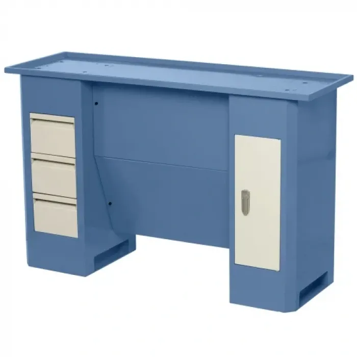 Стойката е изработена от висококачествена стомана, боядисана в цвят RAL5014. Поставката е с дължина 111,5 cm, ширина 38 cm и височина 74 cm. Разполага с три чекмеджета и шкаф за съхранение. Универсалната маса Bernardo D6 Deluxe е подходяща за стругове.