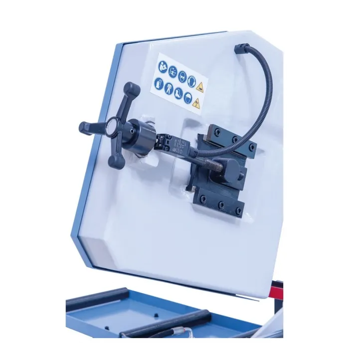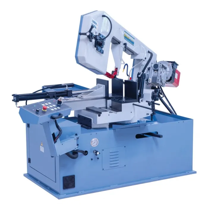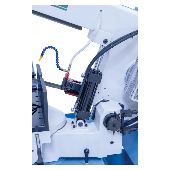 Работното рамо на машината се накланя наляво (-45°) и надясно (+60°) за рязане под наклон. Полуавтоматичната лентоотрезна машина е отличен избор за рязане на кухи профили, неръждаема стомана, инструментална стомана и др. Безстепенната скорост на рязане и хидравличното менгеме осигуряват удобна работа. Полуавтоматичната функция увеличава производителността, което прави този модел идеален за машиностроителни, формовъчни и металообработващи цехове.