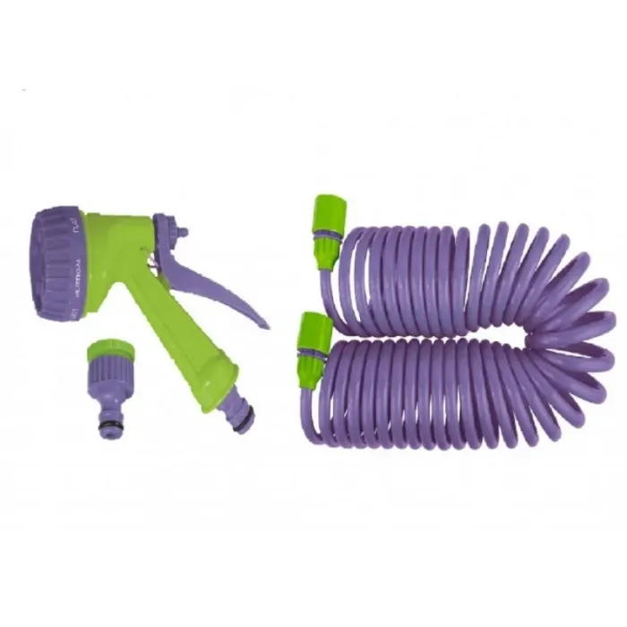 Комплектът е подходящ за ползване в двора и градината. Комплекта за поливане включва от спираловиден маркуч с дължина 7.5 метра, адаптер 1/2" - 3/4" и пистолет. Маркучът се разтяга и не заема много място, а крайщата са с бързосвалящи се връзки: в единия край - адаптер 3/4”, а в другия – пръскачка.