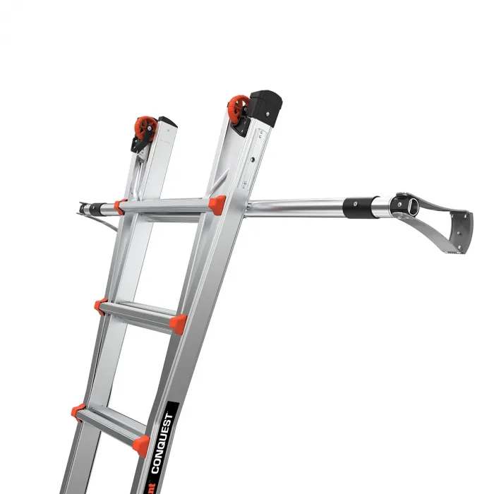 Стълбата разполага и с две допълнителни предпазни релси, благодарение, на които можете да се изкачите безопасно до и на покрив, както и да облегнете самата стълба от двете страни на прозорец. Те също служат като предпазни дръжки при слизане от стълбата. Conquest™ PRO All-Terrain отговаря и дори надхвърля всички европейски стандарти. Мултипозиционна стълба с разтегателни нивелиращи крака, които адаптират вашата стълба към неравни терени и ѝ осигуряват висока стабилност.