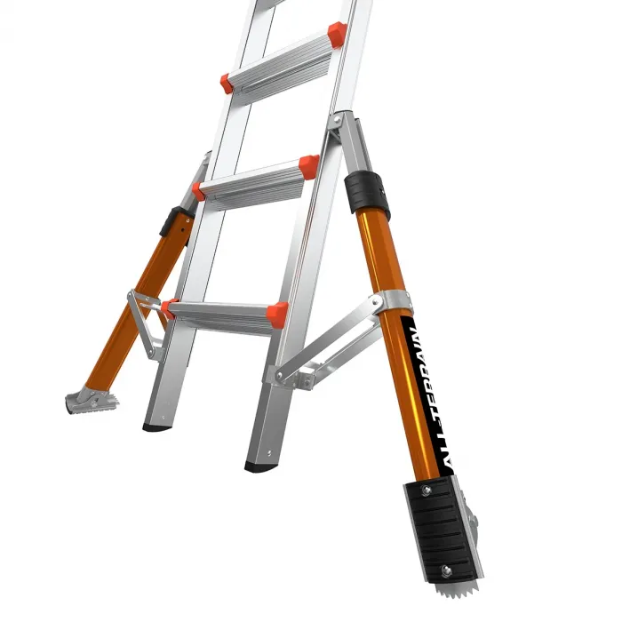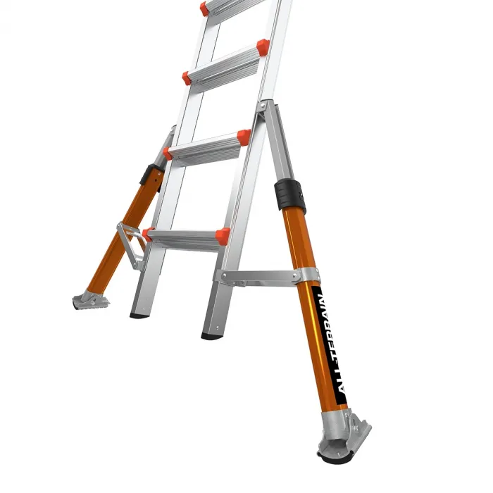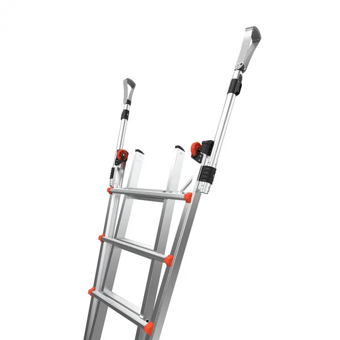 Стълбата разполага и с две допълнителни предпазни релси, благодарение, на които можете да се изкачите безопасно до и на покрив, както и да облегнете самата стълба от двете страни на прозорец. Те също служат като предпазни дръжки при слизане от стълбата. Conquest™ PRO All-Terrain отговаря и дори надхвърля всички европейски стандарти. Мултипозиционна стълба с разтегателни нивелиращи крака, които адаптират вашата стълба към неравни терени и ѝ осигуряват висока стабилност.