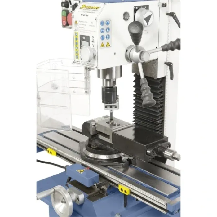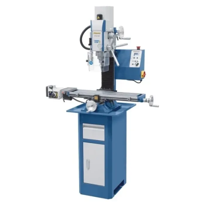 Машината се използва за фрезоване на канали, челно фрезоване и пробиване. Фрезовата глава може да се накланя на двете страни, позволявайки ъглово пробиване и фрезоване на скосяване. С EMC филтър предпазващ електрическото оборудване от електромагнитни смущения. Фрезата за метал e оборудвана с висококачествен двигател с постоянен ток. Това води до много предимства като високия въртящ момент при ниска скорост и почти постоянната скорост по време на обработка. Машината за фрезоване е предназначена предимно за професионална употреба. Голямата кръстосана маса разполага с Т-образни прорези и висококачествено покритие на повърхността.