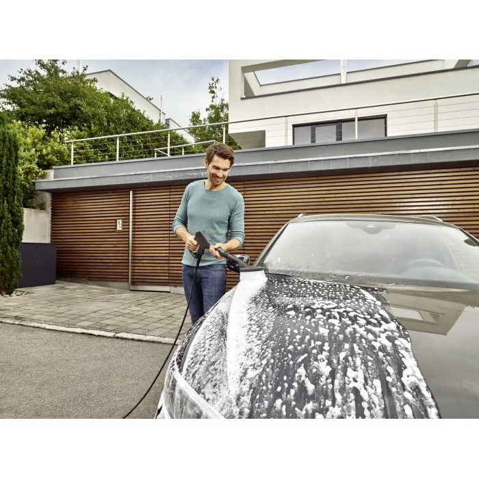 K 3 Power Control впечатлява и с телескопична дръжка за удобно транспортиране и съхранение, стойка за по-голяма стабилност, държачи за принадлежности, пистолет за високо налягане и кабел, както и системата Kärcher Quick Connect. Стойката може да се използва като дръжка за носене, което ви позволява лесно да съхранявате и зареждате устройството. Комплектът за почистване на кола включва четка за измиване за премахване на сивия слой и пеногенератор, който осигурява добре прилепваща пяна и максимална сила на разтваряне на мръсотията, както и 500 ml шампоан за кола.