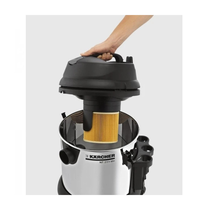 Индустриална прахосмукачка Karcher NT 27/1 Me 1380 W е компактна, маневрена и особено лесна за употреба за мокро и сухо почистване за универсална индустриална употреба. Изключителната мощност на изсмукване на NT 27/1 Me се дължи на мощната засмукваща турбина. Той е оборудван с патронен филтър. Механична система с поплавъчен превключвател при достигане на максималното ниво на пълнене за удължаване на експлоатационния живот и щадяща употреба. Практичната Clip-система за бърза смяна, съответно включване на аксесоарите дава възможност за безпроблемна работа. Пет управляващи колела се грижат за лесното движение, мобилността и стабилния ход. Освен това е оборудвана с практична плоскост за съхранение, която е монтирана върху горната част на духалката. Друга допълнителна точка на индустриална прахосмукачка Karcher NT 27/1 Me 1380 W е системата за съхранение на аксесоарите и куката за кабела на уреда. Ергономичната дръжка за носене с място за поставяне на тръбата гарантира лесния и удобен транспорт на уреда заедно с всички аксесоари. NT 27/1 Me е защитен от всички страни с рамка, която не предпазва само уреда, а и стените, машините и мебелите, срещу повреждане.