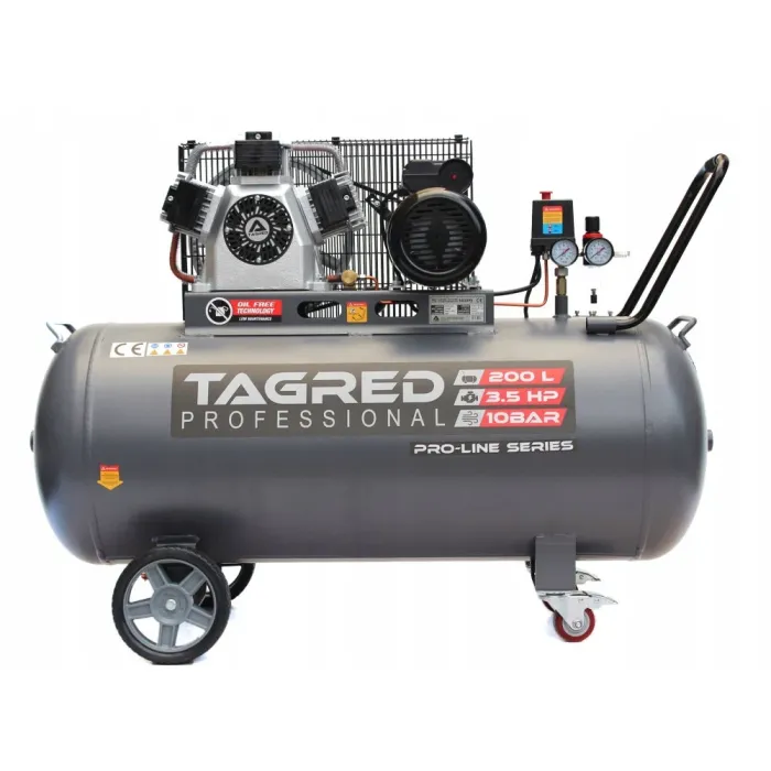 Безмасленият компресор TAGRED използва функционален и практически неизискващ поддръжка блок с бутало и диафрагма. Използваното решение прави въздушния компресор много тих и ефективен, може да се използва както в помощни помещения, така и у дома.
