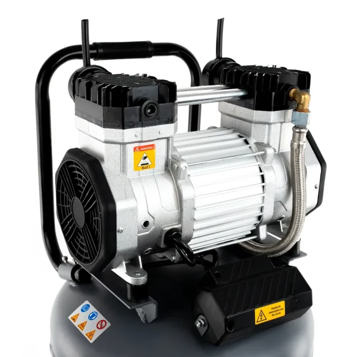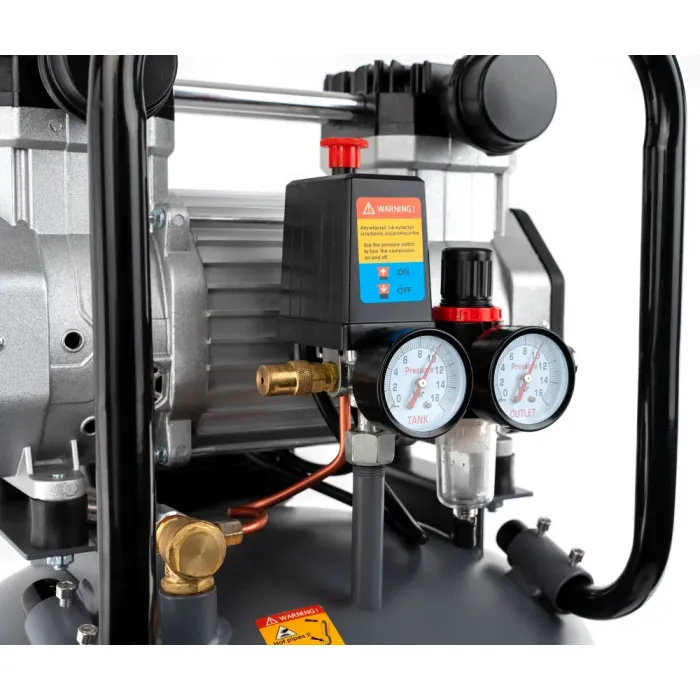 Тих компресор без масло - професионален източник на чист въздух без масло. Надеждната и тиха помпа може успешно да се постави в офис, учебна стая или до машина, без да влошава дискомфорта, причинен от шумна работа. Главите са оборудвани с въздушен филтър с ефективна вентилационна система - това решение ви позволява да постигнете максимална ефективност от сравнително малък компресор и отделни предпазни клапани