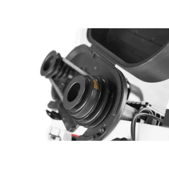 Контролният панел се намира точно до червячната предавка. Задвижващата система на режещата лента се състои от две чугунени колела. Първото се нарича опъващо колело (регулирането се извършва с помощта на лост), второто се нарича задвижващо колело. Въртящият момент от червячната предавка се предава директно към задвижващото колело, докато червячната предавка се задвижва от електрически двигател.
