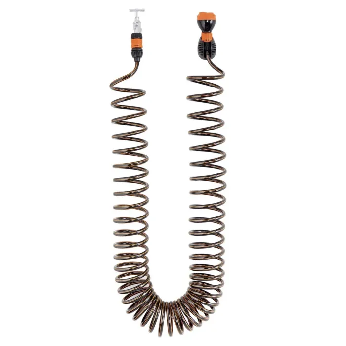 Благодарение на качеството на материалите и спиралната памет, маркучът винаги ще възвърне първоначалната си форма след употреба. Комплектът включва 15 метра спирален маркуч, 3/4” (20-27 mm) съединител за кран с резба, автоматичен куплунг, автоматичен куплунг с Aquastop, многофункционална пръскаща тръба с 4 различни струи (душ, концентрирана, аерирана, мъгла + 1 позиция ИЗКЛ.) , скоба за стена с винтове и дюбели. Спирален маркуч, идеален за използване на балкони, тераси, малки градини, лодки и къмпинги.