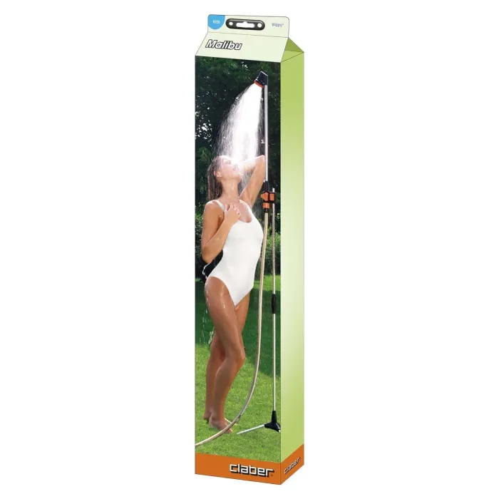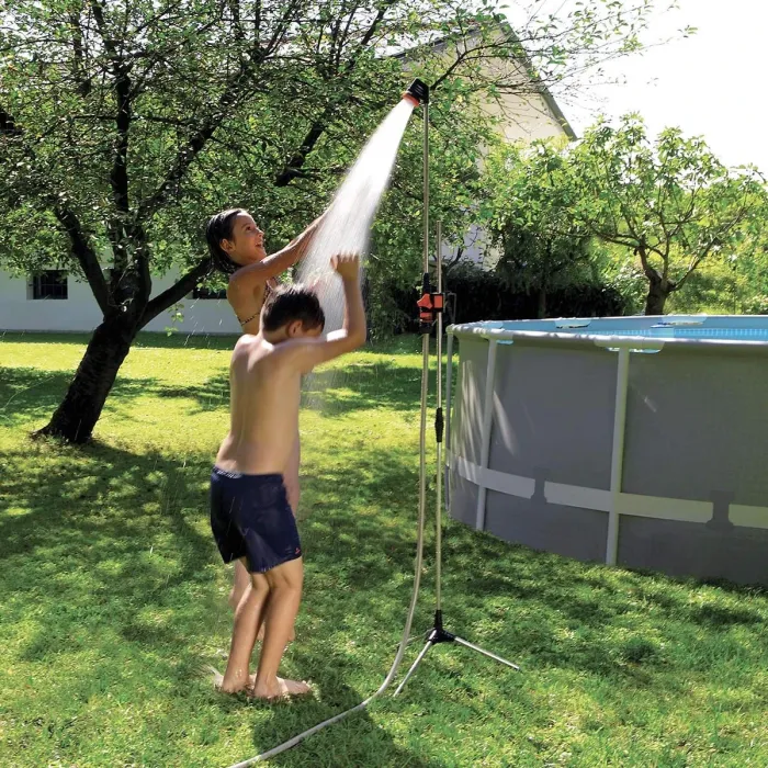 Градинският душ е лек и устойчив. Градинския душ е с регулируема височина до 200 см. Градинския душ с тринога е подходящ както за двор и къмпинг, така и за тераси. Има клапан за регулиране на водния поток.