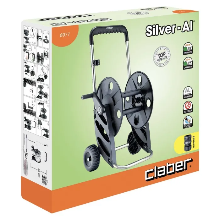 Барабанът на макарата се върти плавно на лагери delrin. Контурни, частично затворени колела за движение дори между най-тесните пространства. Доставен съединител за свързване на маркуча; включена скоба за закрепване на маркуча. Компактна опаковка за улесняване на транспортирането, съхранението и излагането в търговските обекти. Капацитет на макарата за маркуч: 60 м (1/2” маркуч) или 50 м (5/8” маркуч). Предлага се разглобена в комплект за бързо и лесно сглобяване без инструменти. Ергономична пластмасова дръжка. Здрава, лека неръждаема алуминиева рамка. Напречни профили без остри ръбове, с тръбна укрепваща структура.