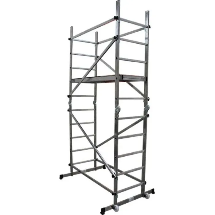 Профил - изработен от висококачествен алуминий 63х24мм и дебелина 1,2 мм и стъпало 30х30мм с дебелина 1,5 мм. Максимална височина на платформата 2,00 м. Размер на работната платформа - 0,50 х 1,50 м. - изработена от влагоустойчив шперплат със сито ефект против приплъзване. Скелето е изградено от две мултифункционални шарнирни стълби с по 5 стъпала, които могат да бъдат използвани отделно като обикновенни стълби, което дава допълнителни възможности за функционалността на скелето.