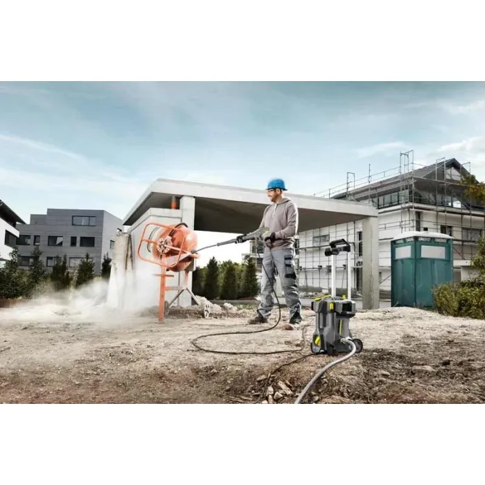 Водоструйката е подходяща за вертикална и хоризонтална работа. Практичните функции за съхранение на аксесоари включват отделение за дюзи, винтова връзка (EASY!Lock) за Surface Cleaner и практична гумена лента за закрепване на маркуча под налягане. Автоматичната система за освобождаване на налягането впечатлява с предлагането на ясни предимства: защитава компонентите, удължава експлоатационния живот, намалява разходите за ремонт и поддръжка и намалява теглителната сила на новия пистолет за високо налягане EASY!Force. Това също така използва силата на отката на струята под високо налягане, за да намали силата на задържане до нула. Скрепителните елементи за бързо освобождаване EASY!Lock, които също са нови, правят манипулирането пет пъти по-бързо, отколкото с конвенционалните винтови връзки, без компромиси, когато става дума за здравина и дълготрайност. Преносимият уред за високо налягане HD 5/13 P Plus впечатлява със своя компактен дизайн, ниско тегло и изключителна мобилност. Машината разполага с надеждна трибутална аксиална помпа с месингова цилиндрова глава. Допълнителна дръжка за носене и разтегателна дръжка за бутане улесняват транспортирането и съхранението на машината в малки пространства.