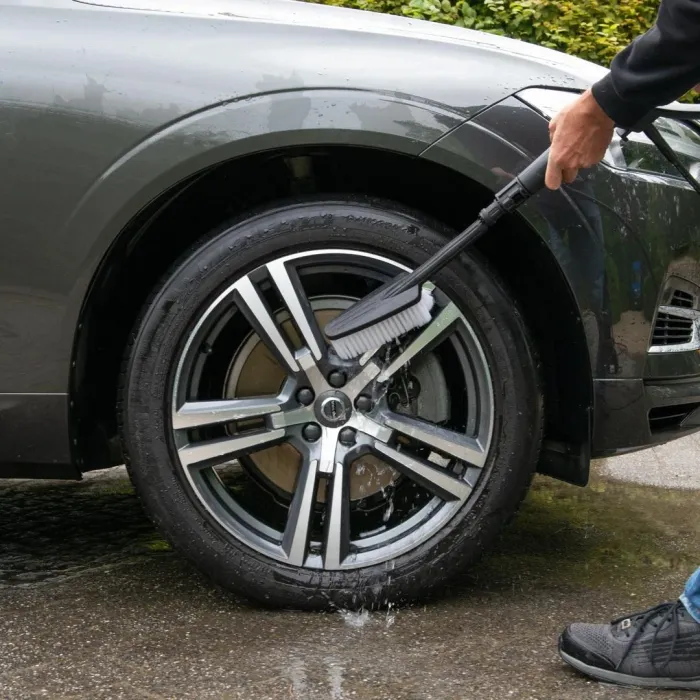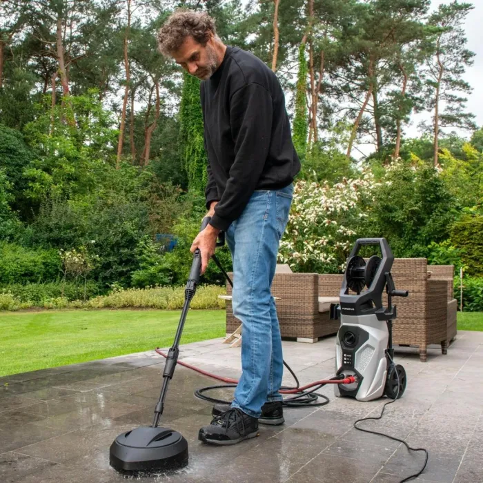 Аксесоари: Тази машина за миене под налягане се доставя с различни аксесоари. Благодарение на регулируемата дюза можете да избирате между мощна прецизна струя или по-мека струя. Фиксираната четка е идеална за почистване на автомобили или други чувствителни повърхности, благодарение на меките косми. За да премахнете особено упоритите замърсявания, можете да използвате турбо дюзата. Освен това има почистващ препарат за вътрешен двор, така че можете да почистите своя вътрешен двор без риск да го повредите.