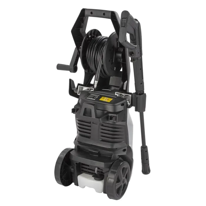 Макара за маркуч: Уредът за почистване под високо налягане е оборудван с вградена макара за маркуч за лесно навиване на маркуча за високо налягане. Това предпазва маркуча без прегъвания и позволява компактно съхранение.