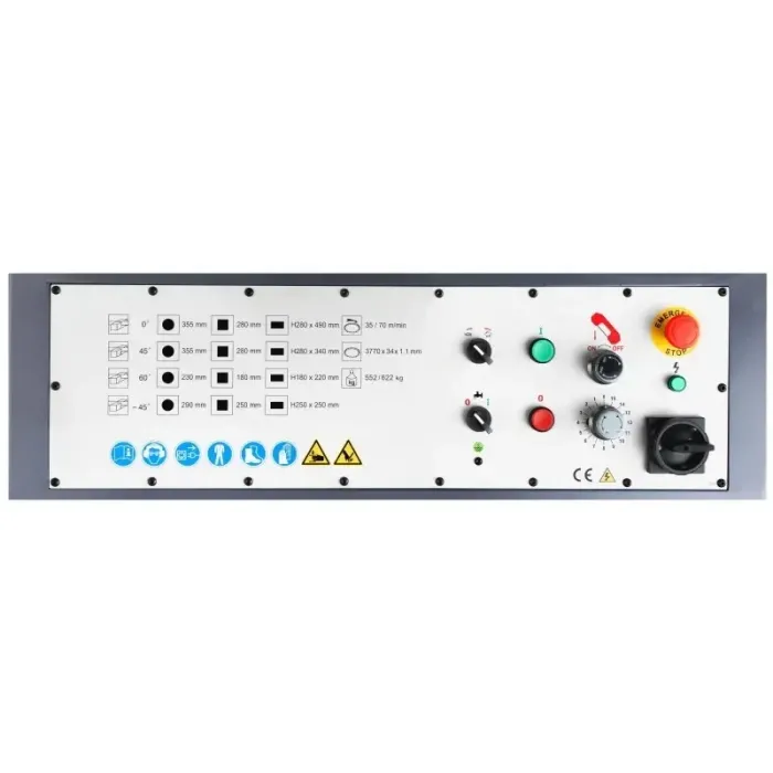Контролният панел е ергономичен и има ясно разположени бутони, като главен превключвател, бутони за включване, изключване, охлаждане и скорост на лентата (бавно/бързо). В допълнение панелът е оборудван с авариен превключвател, който отговаря на най-новите стандарти за безопасност на ЕС.