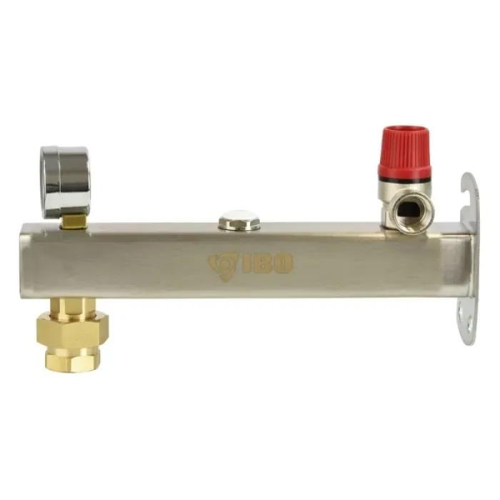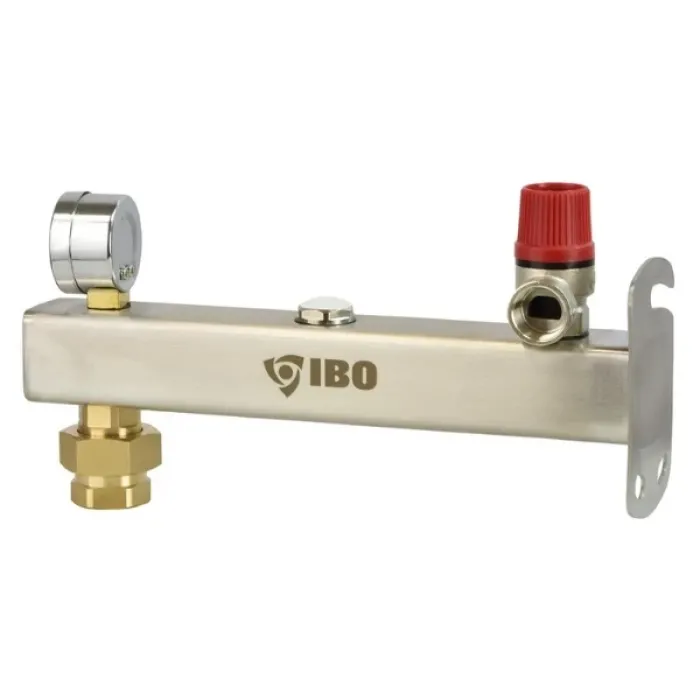Група за безопасност за отопление IBO IGB INOX 6 bar Групата за безопасност IGB INOX 6 е надеждно решение, използвано в инсталации за централно отопление и системи за битова гореща вода (БГВ). Неговата основна задача е да осигури безопасност чрез контролиране и защита срещу прекомерно повишаване на налягането. Работи с разширителния съд, което позволява правилното му монтиране и експлоатация. Конструкция и функционалност Групата за сигурност е оборудвана с няколко ключови компонента, които я правят ефективна. Комплектът включва манометър, който позволява текущо следене на налягането, предпазен клапан, който реагира при повишаването му над допустимото ниво и сервизен клапан, който улеснява поддръжката и проверката на инсталацията. Здравата конструкция е още едно предимство на този модел. Предпазната група IGB INOX е изработена от висококачествена неръждаема стомана INOX, което гарантира нейната устойчивост на корозия и дълъг експлоатационен живот. За стабилен монтаж устройството има практична монтажна лента, която ви позволява лесно да закрепите целия модул към стената с помощта на дюбели и винтове. Принципи на избор и монтаж При избора на подходяща група за безопасност е изключително важно налягането на отваряне на вентила да е по-ниско от максимално допустимото налягане на котела. В противен случай може да възникне неконтролирано повишаване на налягането, което може да застраши цялата инсталация. Групата за безопасност от 6 бара е проектирана да работи в тежки условия. Максималното му работно налягане е 6 бара, което го прави подходящ за повечето стандартни отоплителни инсталации. Устройството може да работи при температури до 90°C и поддържа инсталации, където максималната концентрация на гликол е 50%. Диапазонът на отчитане на манометъра е 0 - 4 bar и 0 - 10 bar, което позволява прецизно следене на налягането в системата. Максималният диаметър на експлоатационния разширителен съд е 320 mm , което прави устройството универсално и съвместимо с много отоплителни системи.