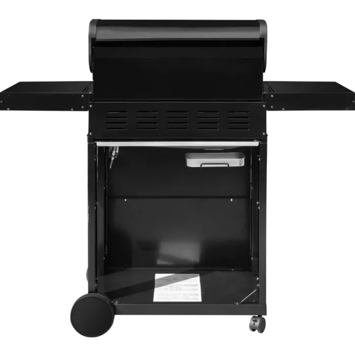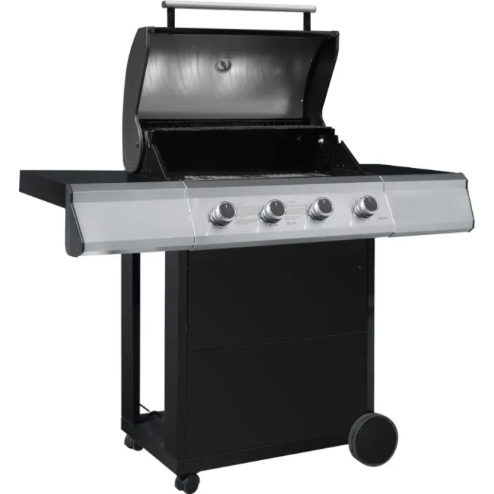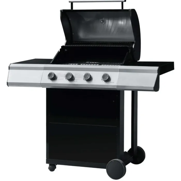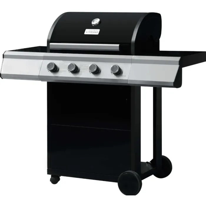 Има вграден термометър, топлоотразители и двуслоен капак. Газовото барбекю има четири независими горелки с обща мощност 12 kW. Всяка горелка е изработена от неръждаема стомана и се регулира отделно. Барбекюто разполага с 3 бр. чугунени решетки и резервоар за събиране на мазнините. Уреда е подходящ за градината или вилата. Оборудван е с 2 странични рафта, 2 колела със спирачки и 2 големи колела за лесно придвижване. Работната повърхност на решетката за печене е 61 х 41 см, а на грила за поддържане и затопляне - 51 х 17 см.