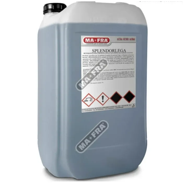 Специфичен продукт за почистване на джанти от всички сплави и алуминий с блестящо действие, SPLENDORLEGA разтваря и бързо отстранява, без агресия, мръсотията и остатъците от черни метали, отложени по джантите, като възстановява първоначалния им вид. SPLENDORLEGA е подходящ и за почистване на пластмасови капаци на джанти.