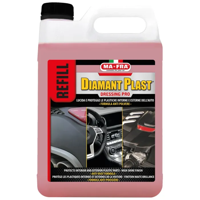 Diamant Plast Dressing Pro е обновяващ, защитен полиращ продукт за автомобилни пластмаси. Формулата е смес от вакса на основата на карнауба и хидрофобни полимери. Карнаубската вакса е известна със своята устойчивост на атмосферни влияния, абразия и ежедневно износване, като защитава пластмасите на Вашият автомобил от увреждане. Благодарение на своята иновативна формула, той оставя повърхностите с превъзходен блясък. Създава ефективна прозрачна анти-UV защитна бариера, която предотвратява отлагането на замърсявания, прах и преждевременното стареене на пластмасите.