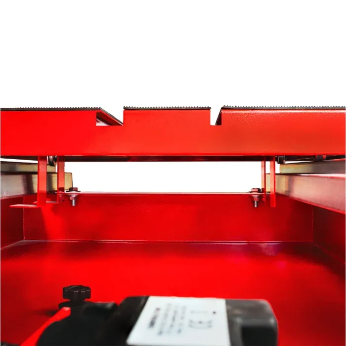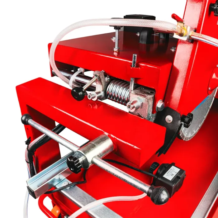 Благодарение на регулируемата ръкохватка и транспортира (линеал с градуси), машината позволява рязане под ъгъл от 0° до 45°. Това е идеално при направа на фуги, оформяне на ъгли и декоративно подреждане на плочки. Здравата метална рамка и стабилните крака на машината позволяват продължителна работа с минимална умора. Плъзгащият плот и удобните ръкохватки осигуряват лесно управление и пълен контрол над рязането. Машината е снабдена с вътрешен термостат, който автоматично изключва мотора при прегряване или претоварване. Това предпазва двигателя от повреди, удължава живота на машината и осигурява спокойствие по време на работа. Машината разполага с предпазен капак за диска. С номинална мощност от 2200 W, машината предлага стабилна работа и висока производителност при рязане на твърди и гъсти строителни материали. Стабилните 2800 об./мин гарантират гладко и прецизно рязане без накъсване на материала. Режещият диск позволява рязане на детайли с дебелина до 90 мм и дължина до 800 мм, което я прави изключително ефективна при работа с големи плочи. Диамантеното покритие осигурява дълъг живот, устойчивост на износване и чист срез. Вградена водна помпа с 37.8 литра резервоар охлажда режещия диск по време на работа. Това не само удължава живота на диска и двигателя, но също така минимизира образуването на прах и повишава безопасността и хигиената на работната среда.