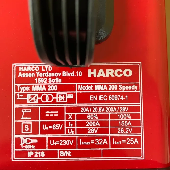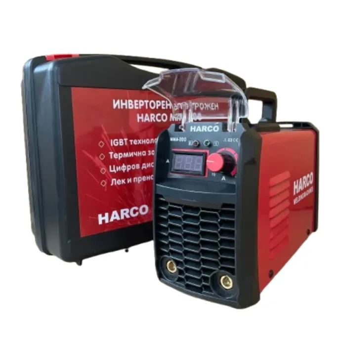 Моделът HARCO MMA 200 е постоянно токов електрожен, в комбинация с правилният тип електроди, е подходящ за заваряване на черна стомана, неръждаема стомана, чугун, алуминий и сплавите му. Апаратът работи без проблем с електроди до 3.2мм. Инверторният електрожен се използва за ръчно заваряване с постоянен ток на конструкционни стомани с обмазани електроди (метод MMA). Това е инверторно устройство, произведено от най-технологично усъвършенстваните компоненти, произведени с IGBT технология. Апаратът е оборудван с автоматични функции HOT START за улесняване на запалването и ANTI STICK за улесняване на отделянето на електрода в случай на залепване и за защита от повреда на устройството.