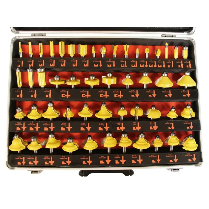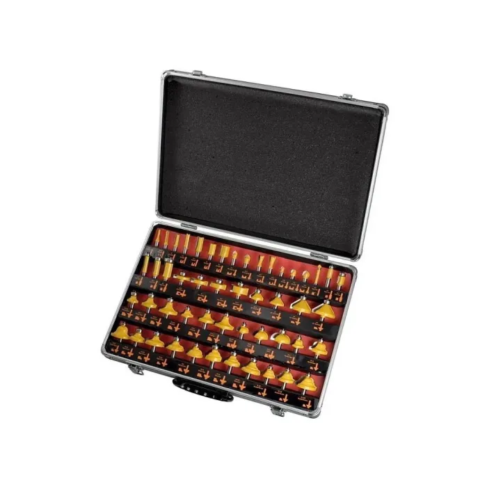 Ножовете за дърво са изработени от висококачествена стомана, снабдени със специални HM остриета, покрити с издръжливо антикорозионно покритие и освен това прецизно заточени. Благодарение на тези свойства, комплектът профилни ножове е идеален за висококачествена и финална обработка на мека и твърда дървесина. Профилните фрезери ви позволяват да обработвате дъски, греди, призми, палуби, летви и други дървени форми и материали. Комплектът от 50 профилни фрезери за дърво е много изчерпателен набор от запоени ножове с различни профили, форми и размери. Ножовете за дърво са снабдени с 8 мм цилиндрична опашка, която позволява удобно и безопасно затягане в практически всички съвременни фрезови машини. Повечето от ножовете с опашка от комплекта дърво са снабдени с опорен сачмен лагер. Опорният лагер на ножа не само позволява удобно копиране според шаблона, но и предотвратява проникването на острието на ножа в детайла по-дълбоко от необходимото. Ножовете за дървени профили се съхраняват в удобен и практичен алуминиев куфар, където всеки нож не само има свое място, но е и защитен от нежелани механични повреди.