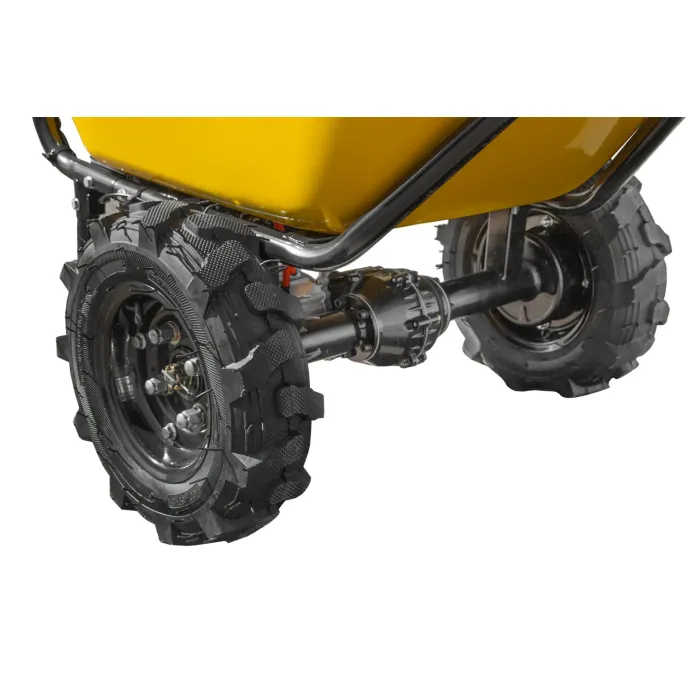 Двурелсовата конструкция осигурява отлична стабилност дори при пълно натоварване . Широките надуваеми колела със стреловидни протектори се справят с неравни, меки и хлъзгави повърхности . Двигателят, разположен на предния мост, разпределя теглото равномерно , намалявайки усилието при управление.