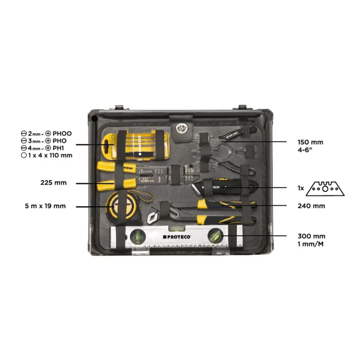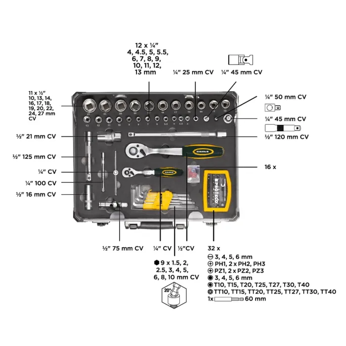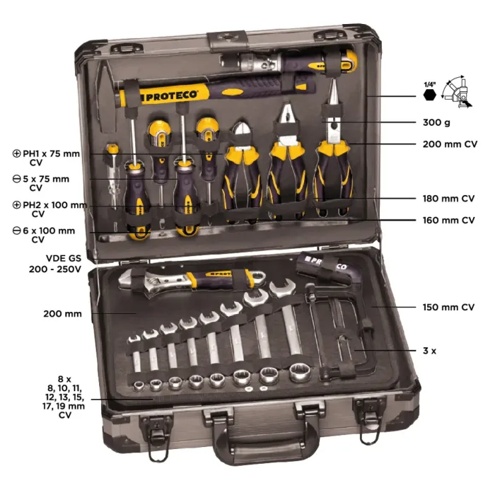 Комплектът се съхранява във висококачествен метален куфар, а отделните инструменти са фиксирани така, че да не се местят по време на транспортиране и да останат на мястото си. Комплектът от 129 инструмента в куфар съдържа широко портфолио от инструменти, подходящи за рутинна поддръжка в работилницата, у дома и на път.