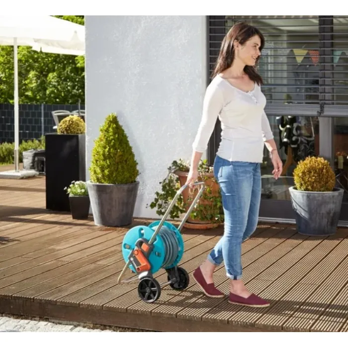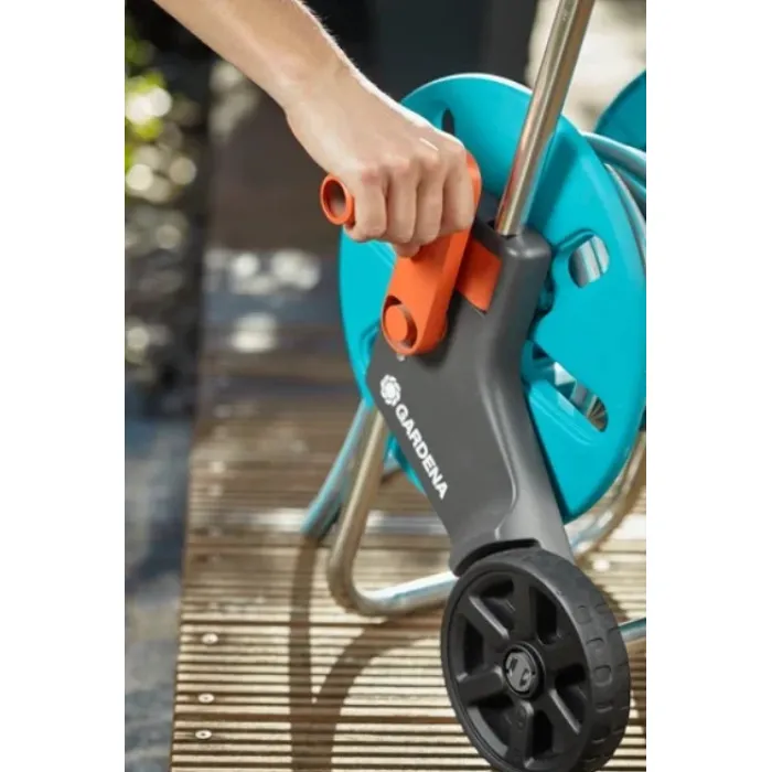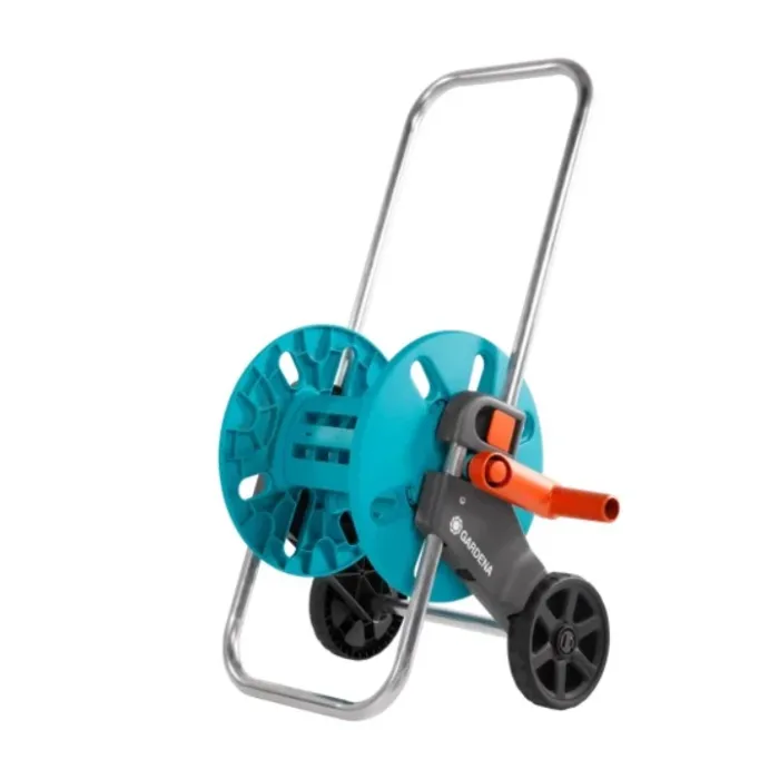 Количка за маркуч празна GARDENA AquaRoll S спестява място при съхранение на градинския маркуч. Голямата солидна манивела надеждно навива маркуча. Иновативна защита от замръзване и 5-годишната гаранция гарантира максимално качество "Произведено в Германия".