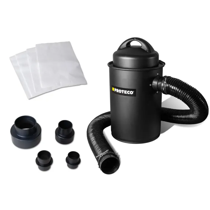Практичната прахосмукачка за дървени стърготини PROTECO 1100 W е предназначена за извличане на всички прахообразни отпадъци, образувани при шлайфане и рязане на дърво, ПДЧ, пластмаси, гипсокартон и подобни материали, чиято обработка произвежда отпадъци с различни размери. Ако не искате постоянно да почиствате дървени стърготини и прах, докато работите в работилницата или на строителна площадка, имаме решение за вас!