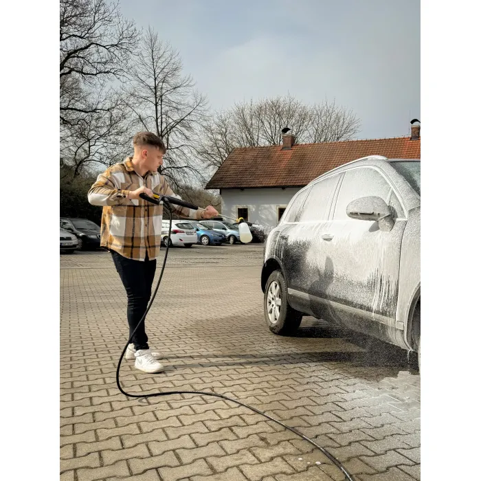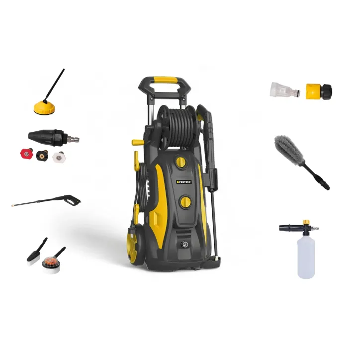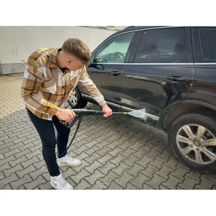 Интегрираната функция за шампоаниране позволява перфектни резултати при измиване на автомобили и фасади. За още по-добри резултати от измиването (с помощта на активна пяна) в комплекта е включен дозатор за препарат, който може лесно да се свърже с пистолета. Почистващата машина е оборудвана и с издръжлив плетен маркуч за високо налягане, който осигурява дълъг експлоатационен живот и надеждност дори при интензивна употреба. Водоструйката е оборудвана с изключително мощен колекторен мотор 3200W, който позволява много ефективно премахване на замърсявания и леки и устойчиви замърсявания от различни повърхности - от измиване на замърсени тераси, градински мебели до измиване на автомобили или фасади.