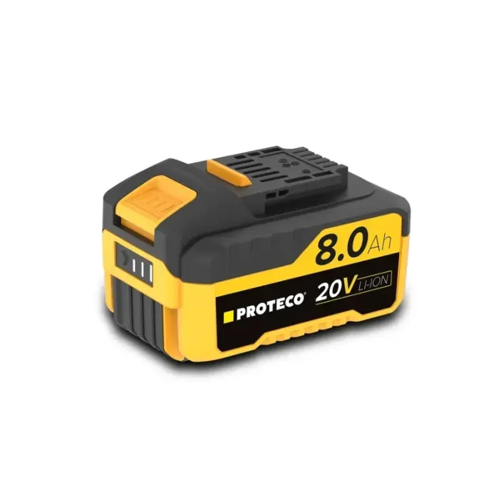 Висок капацитет 8.0 Ah – по-дълъг живот на батерията без прекъсване. Модерна литиево-йонна технология – без ефект на паметта, ниско саморазреждане. Здрав дизайн – идеален за редовна и професионална употреба. Тази 20 V литиева батерия с капацитет 8000 mAh е надежден източник на захранване за всички безжични инструменти от серията PROTECO 20 V. Благодарение на високия си капацитет, тя осигурява по-дълго време на работа с едно зареждане, което ще оцените при по-взискателни задачи у дома, в градината и в работилницата.