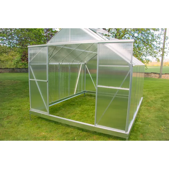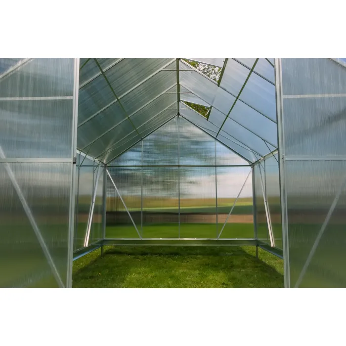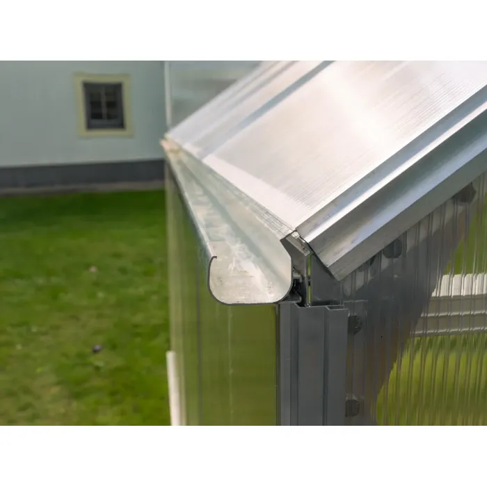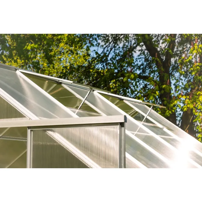 Оранжерията е оборудвана и с практични и функционални характеристики, които ще улеснят работата ви. Тя има двойни врати с плъзгащ се механизъм, които ви позволяват удобно да влизате в оранжерията и да прехвърляте растения. Разполага и с 3 вентилационни прозореца, които могат да се отварят и затварят според нуждите и осигуряват вентилация и регулиране на температурата вътре в оранжерията. Под покрива има водосточни улуци, които отвеждат дъждовната вода и предотвратяват образуването на мухъл и излишна влага във вътрешността на оранжерията.