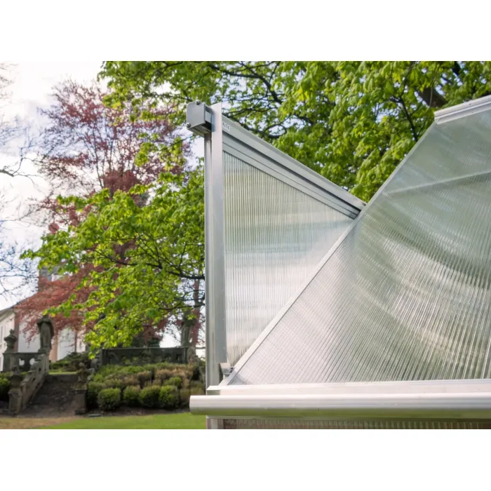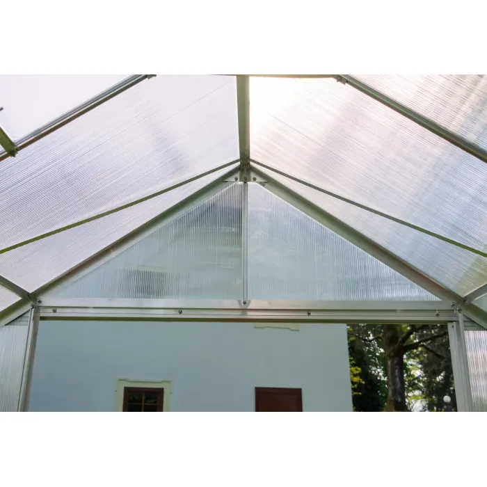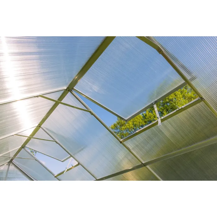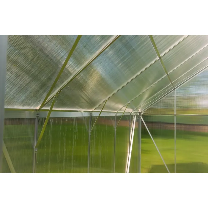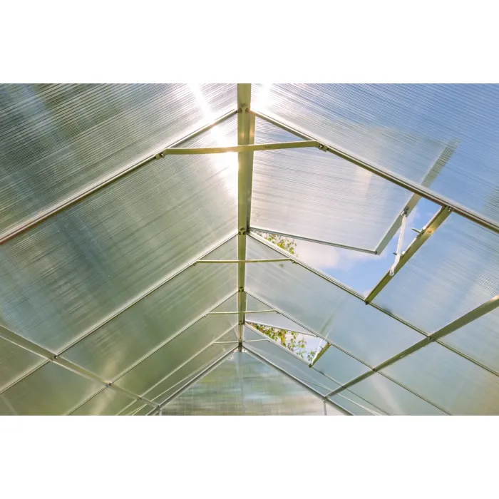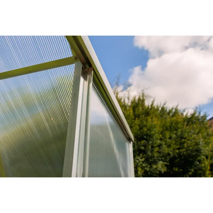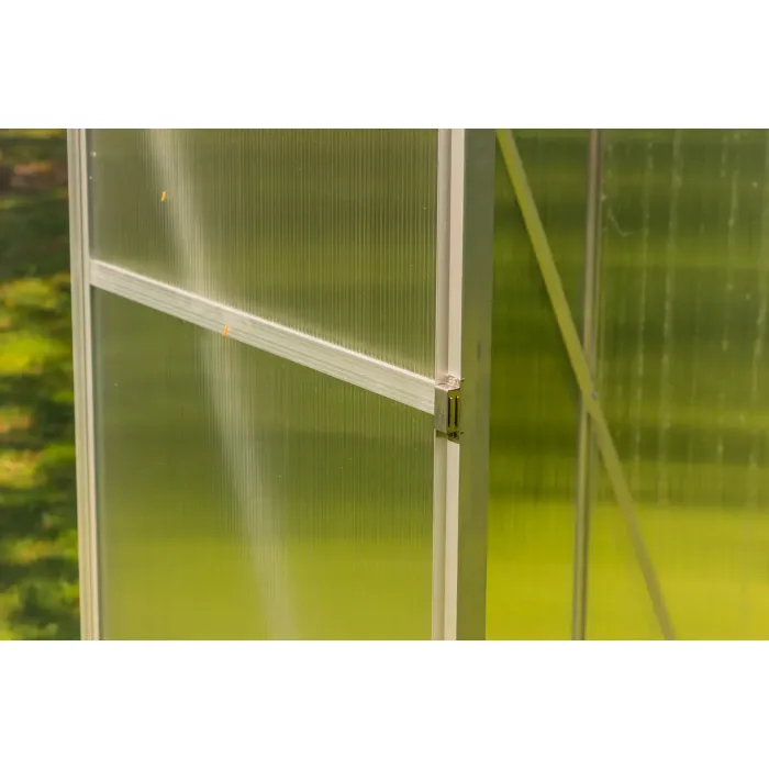 Стените на оранжерията са изработени от 4 мм двустенни поликарбонатни панели с UV защита, които перфектно поддържат стабилни температури и влажност вътре в оранжерията, като същевременно предпазват растенията ви от вредната слънчева светлина, като по този начин осигуряват оптимална среда за растежа им. Панелите са и лесни за почистване.