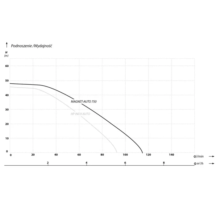 Помпата Magnet Auto 750, въпреки използването на малък двигател с мощност 750 W, постига много висока максимална ефективност до 115 л/мин, което напълно задоволява нуждите на голяма еднофамилна къща (с поливане на градината) или няколко сервизни помещения. Освен това, устройството е изработено в клас S1, т.е. е пригодено за непрекъсната работа.