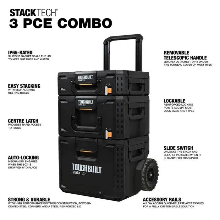 Комплектът от 3 части Stacktech се състои от най-популярните кутии Stacktech. Той включва кутия за инструменти на колелца Stacktech, голяма кутия за инструменти и стандартна кутия за инструменти. Тези кутии за инструменти работят безпроблемно с всички останали продукти на Stacktech и са перфектна основа, за да ви помогнат да изградите специално пригодено, преносимо, модулно решение за съхранение, което да отговаря на вашите нужди.