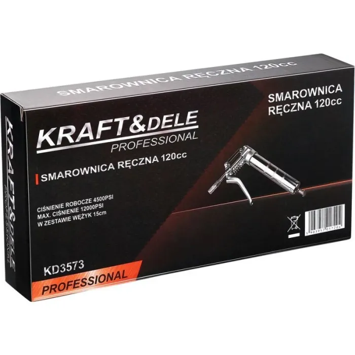 Удобният му дизайн и прецизната дюза позволяват бързо и точно смазване на лагери, съединения и други механични компоненти. Лек и лесен за употреба, този пистолет за смазване е подходящ както за професионални работилници, така и за домашна употреба. Чудесен за поддръжка на селскостопанска техника, автомобили, мотоциклети и велосипеди, както и за технически услуги. Ръчният пистолет за смазване 120 мл е компактен и здрав инструмент, идеален за прецизно нанасяне на смазка на труднодостъпни места. Пистолетът за грес KD3573 ви позволява да дозирате прецизно точното количество грес без риск от препълване или замърсяване. Тесният накрайник улеснява достигането до труднодостъпни точки за смазване. Висококачественото стоманено тяло и ергономичната дръжка осигуряват издръжливост и комфорт при употреба. Устойчив на корозия, издръжлив и готов за работа дори в тежки условия.