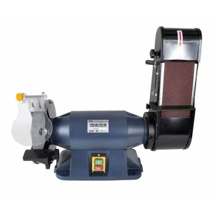 Лек, компактен дизайн, изработен от най-висококачествени компоненти, със защитни метални капаци и капаци от здрава, прозрачна пластмаса, осигурява безопасна и комфортна работа. Много дългият експлоатационен живот на устройството е гарантиран от работа без вибрации, мощен еднофазен мотор с изолация клас B и рамка, изработена от алуминий и желязо, и корпус, устойчив на механични повреди. Характерните черти на настолната шлайфмашина са високо качество на изработка, гъвкавост на употреба и високи работни параметри. Електрически настолен шмиргел с мощност 1050 W, оборудван с шлифовъчен камък и абразивна лента. Шлайфмашина, предназначена за сухо ползване, за шлайфане, заточване и почистване на режещи инструменти, ножове, битове, ключове, метални части и други предмети.