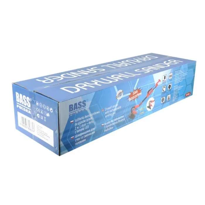 Подвижната LED лампа ви позволява да осветите работната зона. Специалната DELTA глава позволява шлайфане близо до ръбовете на стените, а шарнирно въртящата се глава се движи в много равнини, което позволява шлайфмашината да се регулира спрямо обработваната повърхност и да се шлайфа центърът и долната част на стената, както и ъглите и таваните, без да се променя позицията на оператора. Безчеткова жираф шлайфмашина за мазилка, гипс и шпакловки Bass Polska с регулируема дължина в диапазона 110 - 180 см. Безчетковият мотор на шлайфмашината за мазилка гарантира по-голяма издръжливост и надеждност на устройството.