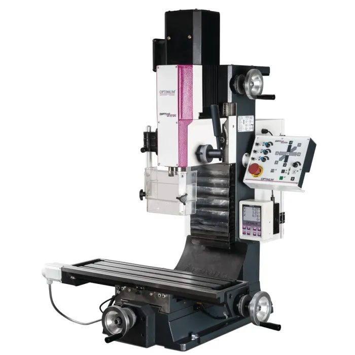 Прецизна фреза с автоматично подаване и цифров дисплей за позицията по трите оси, закрепване на шпиндела BT 30 с механична система за бърза смяна на инструментите, безстепенно задвижване, инвертор, мощност на двигателя 1,5 kW, 230 V, въртене надясно/ляво, напречна маса 620 x 180 мм, фрезова глава, завъртаща се на 0-45° и лесно регулируема височина чрез противотежест в Z-колоната, много плавна работа, особено подходяща за взискателни фрезови и пробивни работи.