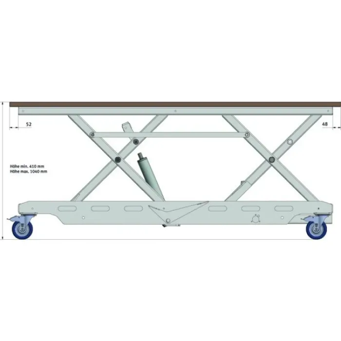 Ножична платформа със здрава конструкция от висококачествени стоманени профили за максимална стабилност. Регулирането на масата до желаната работна височина става чрез хидравличния крачен лост - леко повдигане и противодействие на движението. Принципът на дизайна е с плавно движещ се ножичен механизъм, който гарантира, че платформата може да се повдига и спуска абсолютно паралелно. Лесна е за маневриране, благодарение на четирите колела, с които е оборудвана, като две от тях са със заключване.