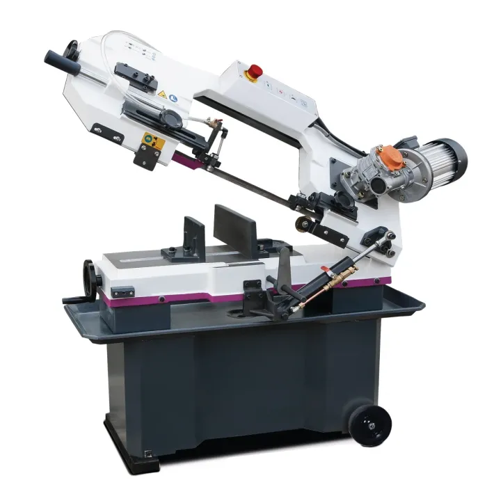 Регулируемият ограничител на материала позволява серийна работа. Лентоотрезната машина за метал е с безстепенно регулиране на спускането на рамото чрез хидравличен цилиндър с дроселна клапа. Напрежението на лентата се регулира от предната страна чрез ръчно колело. Здравата основа на машината е поставена върху големи колела, а удобната транспортна дръжка позволява лесно препозициониране на устройството.
