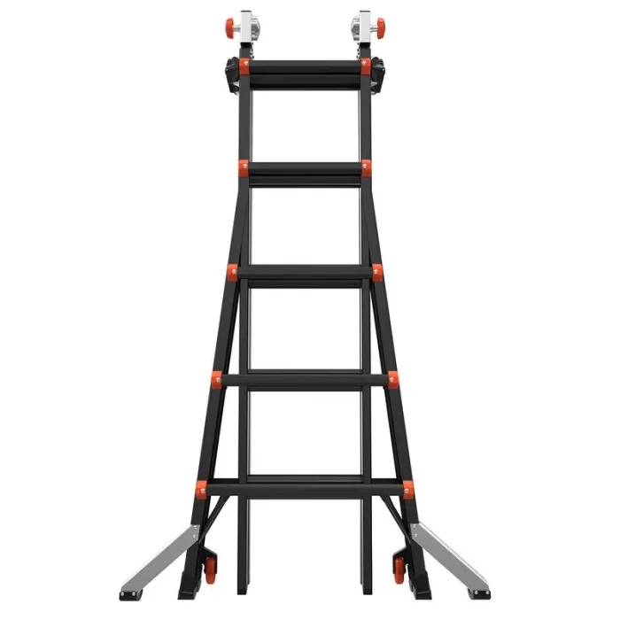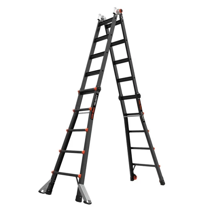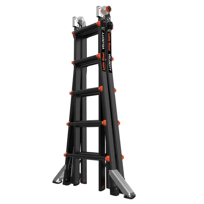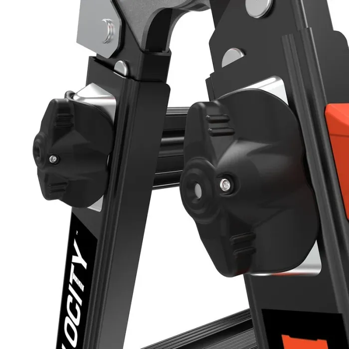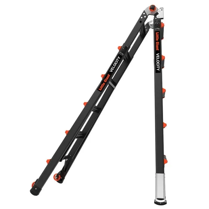 Многопозиционна стълба, която може да се настрои като А-образна стълба, разтегателна стълба, стълбищна стълба, 90-градусова стълба или скеле с естакада и дъски. Лесните за употреба регулатори Rock Lock® преместват вътрешната част на стълбата до необходимата ви височина. Вградените нивелири Ratchet™ на Velocity безпроблемно решават проблема с използването на стълба върху неравен терен. Ако имате нужда от здрава, универсална стълба, Velocity™ от Little Giant Ladder Systems® е идеалното оборудване за катерене. Тази лека, многопозиционна стълба ще ви помогне да вършите работата по-бързо и по-ефективно от обикновената стълба. Защо да носите няколко стълби, когато можете да носите само една? Ако поставяте стълба на място, където земята е наклонена, което води до накланяне или клатушкане на стълбата, просто изпънете нивелирите Ratchet, за да докоснат земята. Ще свършите работата си по-бързо и по-безопасно. Носенето на стълба за продължителни периоди може да натовари тялото, поради което Velocity е оборудвана с колела Tip & Glide™ на Little Giant. Когато трябва да преместите стълбата от място на място, просто я наклонете на колелата ѝ и я затъркаляйте до желаната дестинация. Повече скорост, по-малко умора.