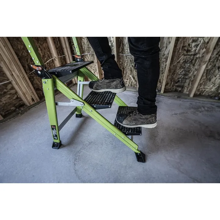Стълба, съчетаваща лекота, стабилност и здравина в едно. С широките си 21.5 см противохлъзгащи стъпала и дизайн наподобяващ стълбище, Little Giant® Jumbo Step™ осигурява изключителен комфорт и усещане за стабилност. Подходяща както за дейности изискващи постоянно качване и слизане, така и за продължително стоене на височина. Jumbo Step™ е лека, фибростъклена стълба с разширени стъпала, която се сгъва в най-малкия профил за съхранение. Идеална за опаковане в товарни помещения на камиони, работа в мазета и всеки проект, който изисква стабилна платформа за стоене.