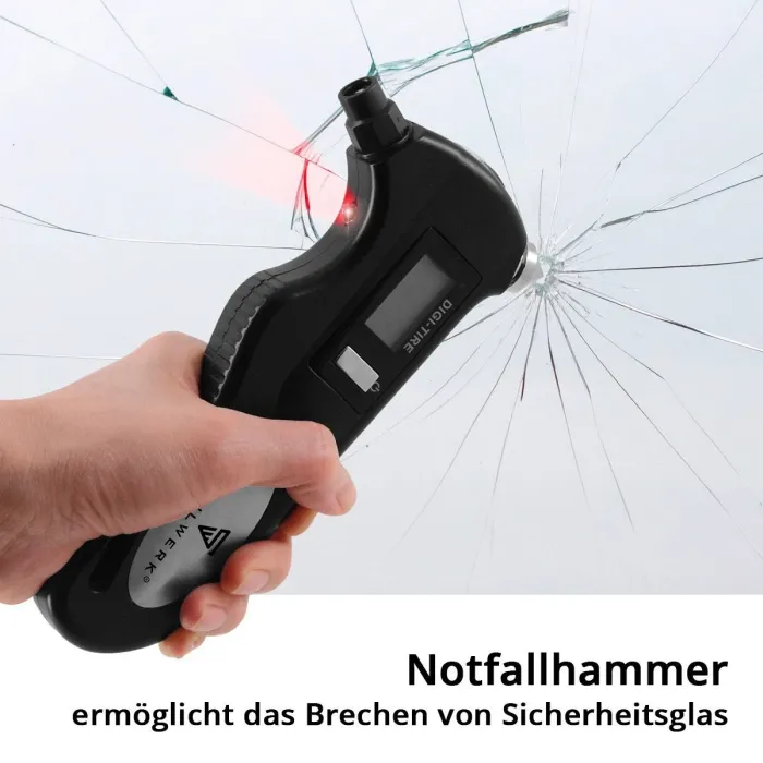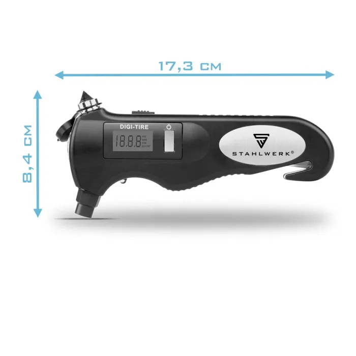 С компактния мултифункционален инструмент налягането в гумите може да се измерва прецизно в барове, PSI, kPa и kg/cm², което е от съществено значение за оптимална безопасност и горивна ефективност. Интегрирани са и други животоспасяващи функции: аварийният чук разбива стъклата на автомобила при спешни случаи, докато ножът за предпазен колан без усилие прорязва предпазните колани, за да позволи бързо бягство. Ярката LED работна светлина в комбинация с осветен LCD екран осигурява оптимална видимост в тъмното. Инструментът за безопасност 5 в 1 е нещо повече от манометър за налягане в гумите и е много полезен както на магистралата, така и по време на дейности на открито. Следователно той не трябва да липсва в нито една жабка като допълнение към аварийния комплект. В допълнение към функцията за прецизно измерване, многофункционалният манометър за налягане в гумите има и други функции, свързани с безопасността. Той съчетава прецизно измерване на налягането в гумите с животоспасяващи аварийни функции, осигурявайки безопасност във всяка неочаквана ситуация.