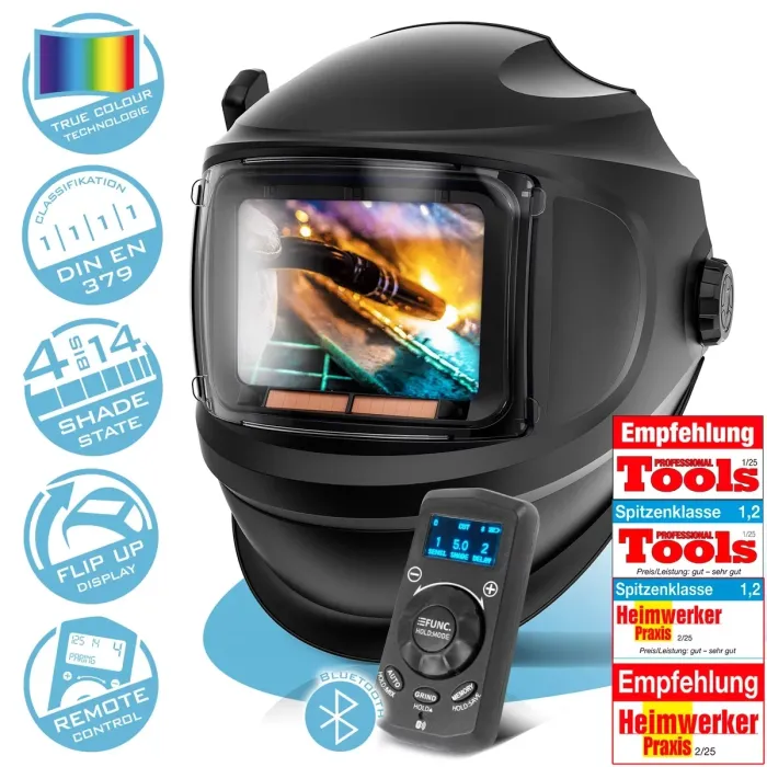 Заваръчната маска надеждно предпазва очите и лицето от вредни светкавици, топлина, искри и високоскоростни частици. Оборудвана с филтърна касета True Color от последно поколение, заваръчната маска осигурява оптимална видимост и отлично възпроизвеждане на истинските цветове. Усъвършенстваната технология за истински цветове предлага значително по-рязко зрение и точност на цветовете в сравнение с конвенционалните филтърни касети с истински цветове. Четири независими сензора осигуряват автоматично затъмняване на заваръчния щит веднага щом дъгата се запали. Напълно автоматичната заваръчна маска има и сензор за околна светлина, който автоматично регулира нивата на затъмнение спрямо дъгата. Автоматичната заваръчна маска 3 в 1 е идеална за професионално заваряване, плазмено рязане, шлайфане, фино рязане и трион, благодарение на Bluetooth дистанционното управление, сгъваемия визьор и оптичните класове 1/1/1/1.
