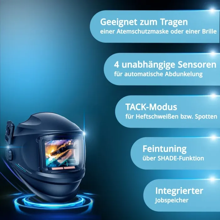 Проектирана за професионална употреба, напълно автоматичната заваръчна каска е особено подходяща като лични предпазни средства (ЛПС) в промишлеността, търговията и „Направи си сам“.