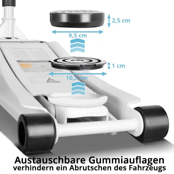 Маневреният крик има мощно двойно повдигащо бутало, което осигурява оптимално предаване на мощността и бързо повдигане на превозното средство. Благодарение на големия обхват на повдигане и високопроизводителната хидравлика, автомобилният крик може да се използва за безпроблемно повдигане на спуснати превозни средства, големи SUV-ове и дори тежки ванове. Крикът е оборудван с две фиксирани и две подвижни безшумни ролки за лесно маневриране. Гумираните ролки на маневрения крик са изключително тихи, плавно вървят се и впечатляват с изключително ниските си шумови емисии. Незаменим при смяна на гуми: Хидравличният крик повдига превозни средства с тегло до 3 тона и има голям обхват на повдигане от 73-500 мм. Благодарение на компактния си дизайн и изключително ниската си конструкция, екстра плоският хидравличен крик може да се използва и в ограничени пространства и с ниски височини на превозните средства.