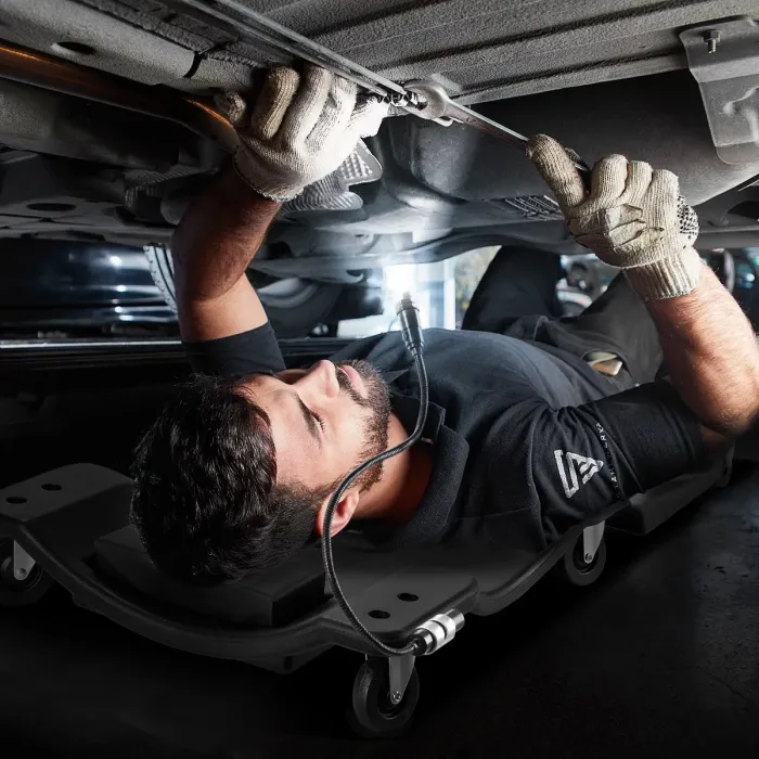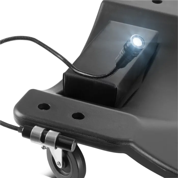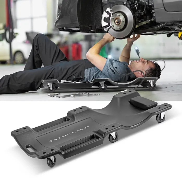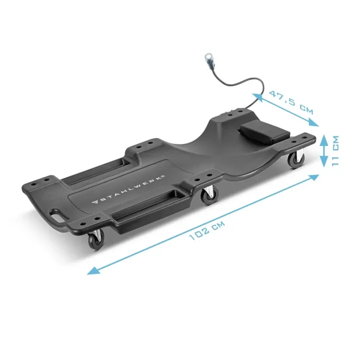 Монтажната лежанка има ергономично оформена повърхност за лежане с подплатена облегалка за глава и вдлъбната зона за раменете и ръцете. Това предпазва главата, врата и гърба по време на монтажни работи под превозното средство. Като специален акцент, ролковата платформа има магнитна LED светлина с гъша врата за осветяване на работната зона. Това ви позволява да работите комфортно дори при лоша видимост. Разполага с практични места за съхранение на инструменти, така че всичко да е винаги наблизо. Здрава, издръжлива и устойчива на корозия, работилническа маса е идеалният помощник за ремонти около автомобила. Автомонтьорската лежанка е с максимална товароносимост от 500 кг предлага максимална свобода на движение при работа в легнало положение. Поддръжката и сервизното обслужване на автомобили, камиони и други превозни средства е значително улеснено с мобилната подвижна работилническа маса.