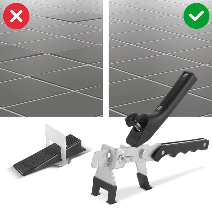 Нивелиращите клещи помагат за професионално и ефикасно позициониране и нивелиране на плочките, идеални за плочки с голям формат или взискателни монтажни проекти, системата гарантира перфектно подравнени повърхности и безупречен краен резултат. Този комплект за нивелиране на плочки е идеален за професионална употреба в занаятите и „Направи си сам“. Комплектът за нивелиране на плочки осигурява прецизно и равномерно разстояние между фугите от 2 мм. С 200 издърпващи се езичета и 100 многократно използваеми нивелиращи клина, той позволява бързо и лесно полагане.